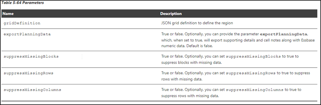 The api_version currently is V3 and the application and plantype should be replaced with the relevant PBCS app and the plantype from which data needs to be fetched. The parameters required or optional are available as part of the documentation with a snapshot below.