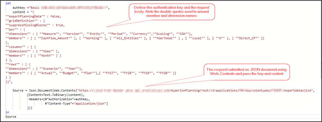 The query has 2 parts, first the authentication key and content (which is the request body JSON, we submit with HTTP POST request) and the submission of request using Web. Contents method. Since the JSON we submit with HTTP POST request have all member and dimension names wrapped in quotes, in order to pass the quotes with the request, we need to wrap the member and dimension names within double-quotes.