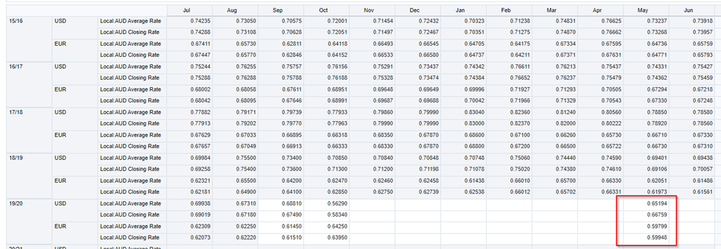 For my application, I need to pull both average and ending rates with base currency as AUD and conversion rates for USD and EUR. The FX rates for May is empty and should eb populated with average and ending rates