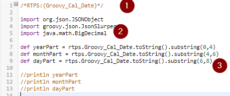 - Section 6 generate values for month and day from the calendar object. Also we declare a list ‘Months’ with all 12 months. This will be used later to pull the month name. It might be possible to return a month name using Groovy but found this to be the easiest way