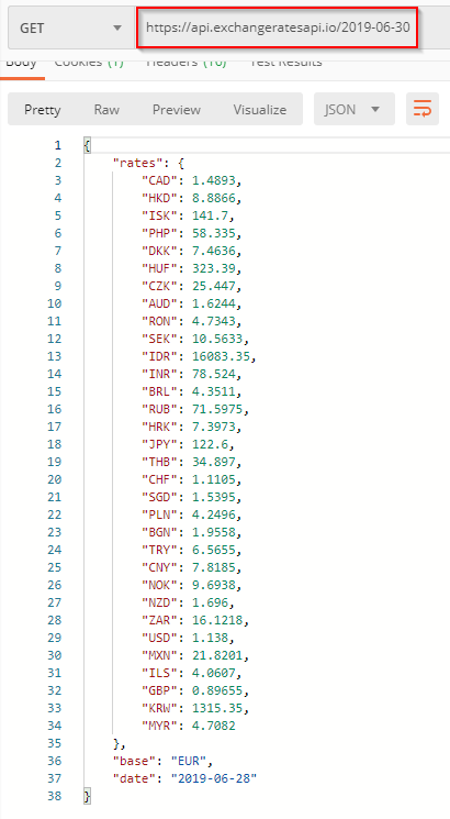 Lets look at the usage of Exchange rates API and how requests can be made to receive JSON responses. I prefer to use Postman app to manually check REST requests but any REST client can be used.
